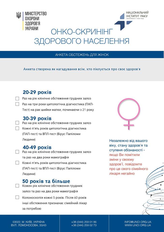 Найбільший та найдорожчий скарб людини – це здоров’я. Як свідчить статистика звернень до Національний Інститут Раку ціною життя стає час та увага до власного самопочуття. Якщо Ви жінка від 20 років та чоловік віком від 40 років, заплануйте на 2019 рік проходження онко-скринінгу та будьте здорові!